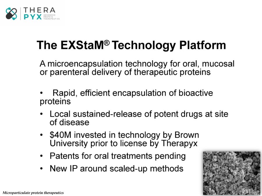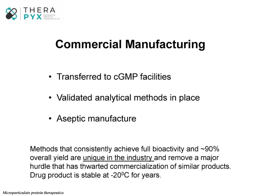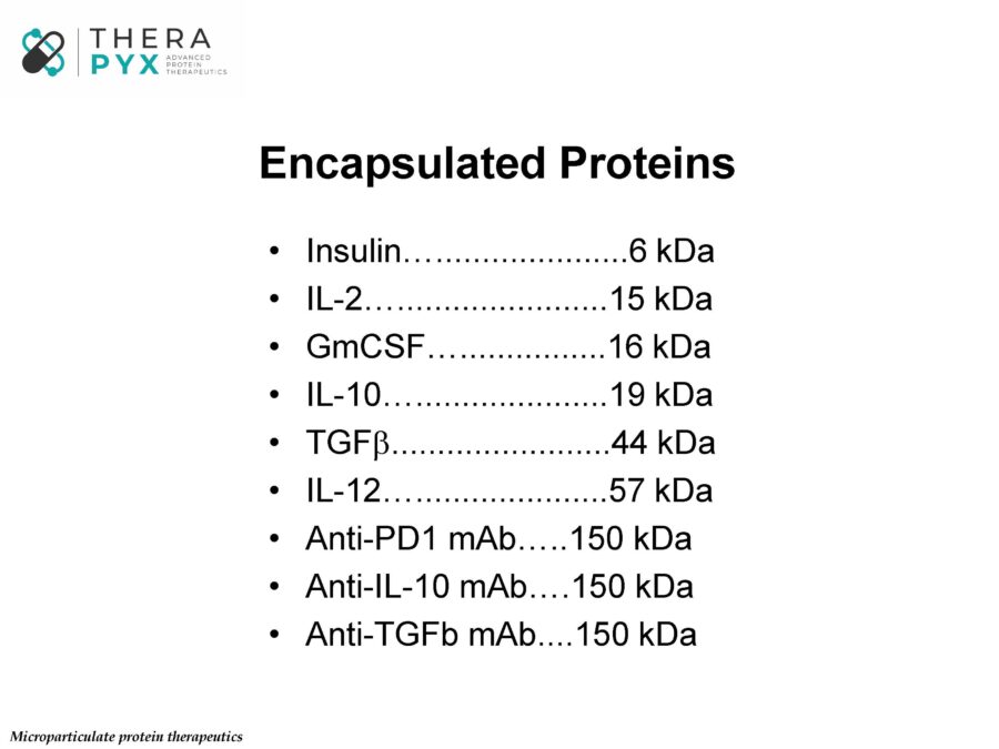 Therapyx is focused on the development of its lead products into first-in-human proof-of-concept clinical studies. An enviable aspect of all our products is that they depend upon the local release of established drug substances with well-understood molecular and cellular targets within disease pathways. All have broad applicability across several diseases. This allows the company to be product rather than indication focused. While we remain deeply committed to advancing our lead products into the clinic, we also maintain a deep pipeline of new products. These include other non-cytokine proteins and other small molecules. For example, Therapyx was recently awarded a small phase I SBIR grant to explore proof of principle pre-clinical studies aimed at the encapsulation of an antibody against IL-10. While still in very early days, these efforts represent the application of our core encapsulation technology to an entirely new class of immune therapeutics and demonstrate our company’s deep commitment to continued new product development.