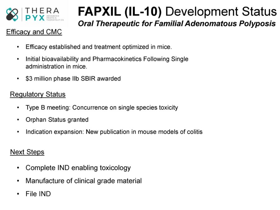 FAPXIL is in currently in preclinical development as an oral treatment for FAP. We have demonstrated that orally administered FAPXIL ameliorated established local and systemic disease and enhanced survival in a murine model of spontaneous intestinal polyposis. This observation was highly significant as it demonstrated that the therapeutic effect of oral FAPXIL treatment extended even to distant and aggressive colonic disease. Largely because of this impressive and unexpected observation, Therapyx was recently awarded a coveted FastTrack SBIR grant by the National Institute for Diabetes and Digestive and Kidney diseases. Among other things, the project will finalize a commercial FAPXIL formulation and establish the applicability of FAPXIL to colorectal cancer. If successful, the next steps are toxicology studies in rodents and non-human primates.
