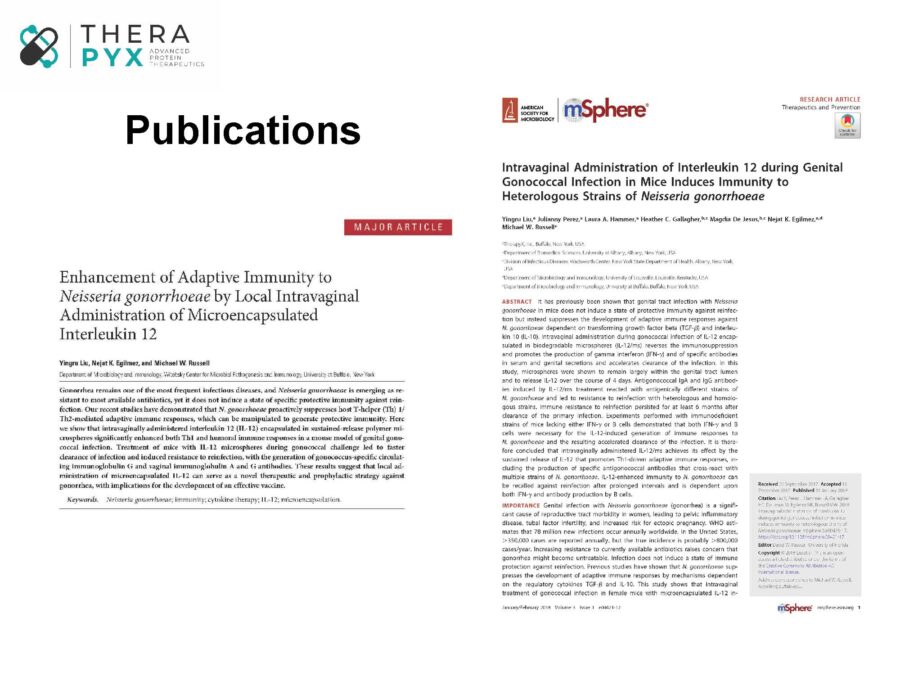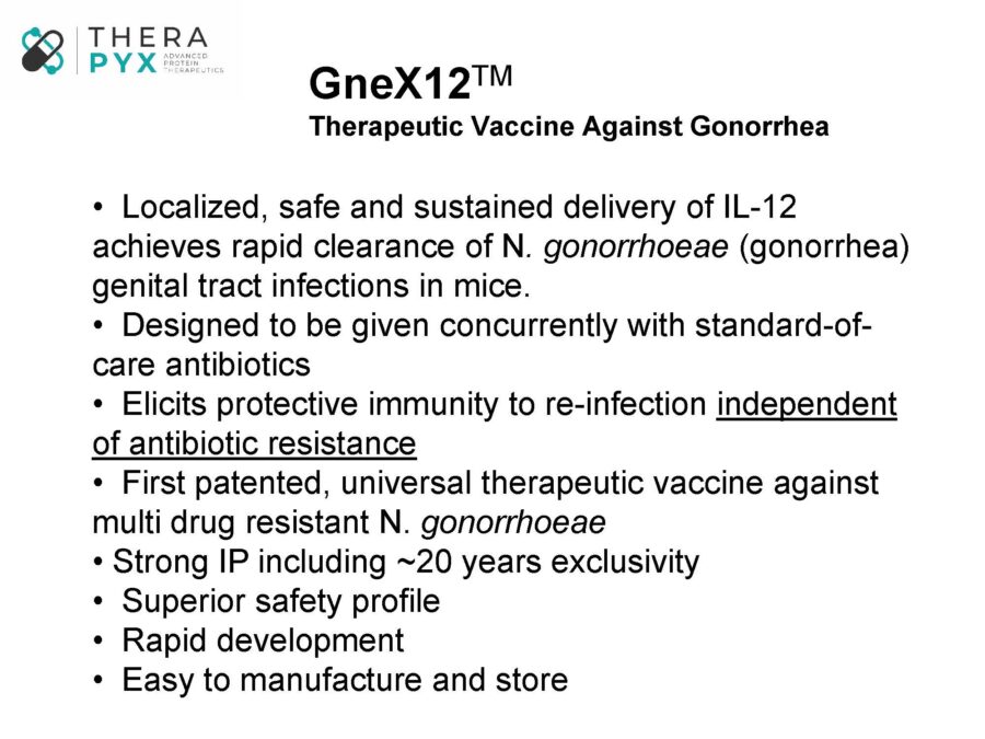 GneX12 is a biodegradable, sustained-release IL-12 formulation designed for mucosal delivery and aimed at the treatment of gonorrhea, one of the most commonly reported bacterial infections in the US with an estimated incidence of over 800,000 annual cases. Normally, the orchestration of innate and adaptive immune responses lead to the clearance of infections. However, many bacteria – including gonorrhea – survive by perturbing the host’s immune response and preventing the development of protective immunity. We have shown that mucosal treatment of mice with GneX12 re-educates the immune response and when given alone, allows rapid clearance of N. gonorrhoeae infection. But most importantly, when given with antibiotics, GneX12 induces protective immunity against re-infection within the host, even against divergent strains of gonorrhea, something that has never been demonstrated before in any species.