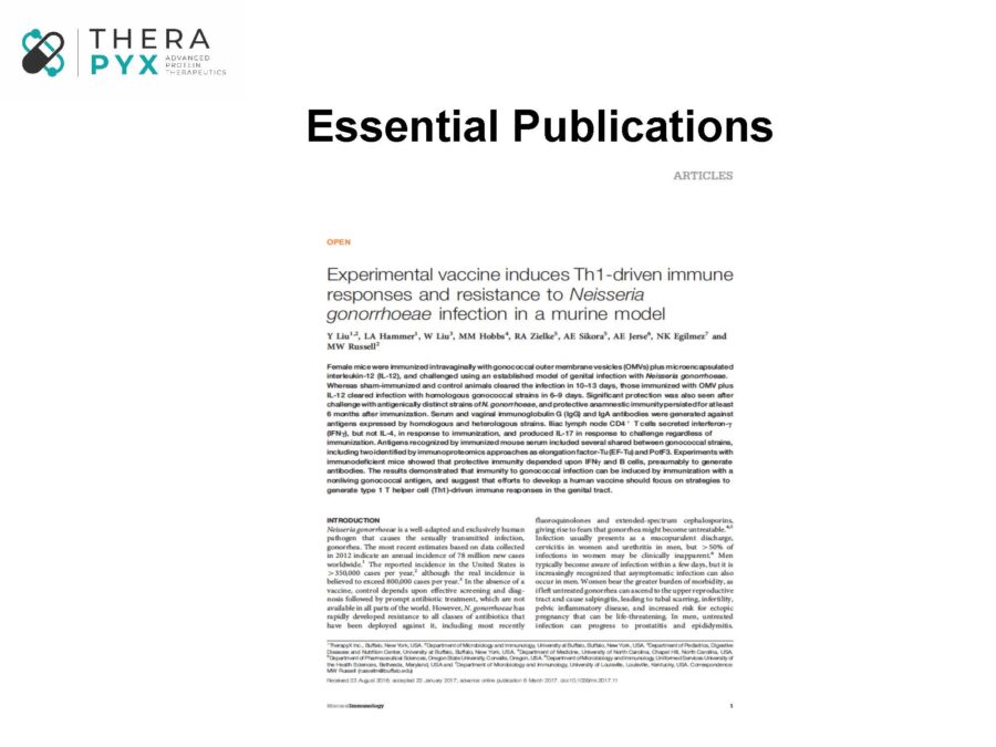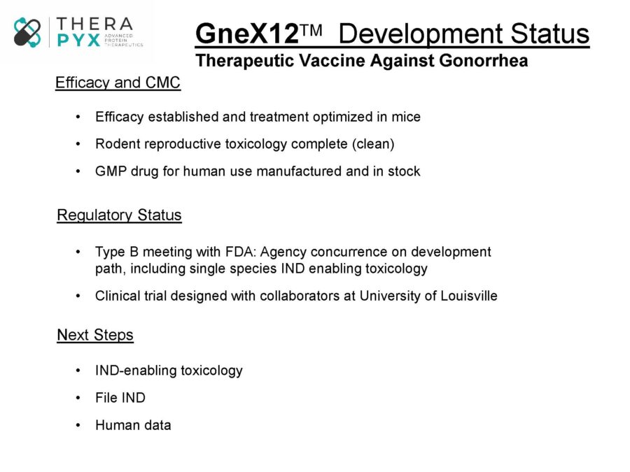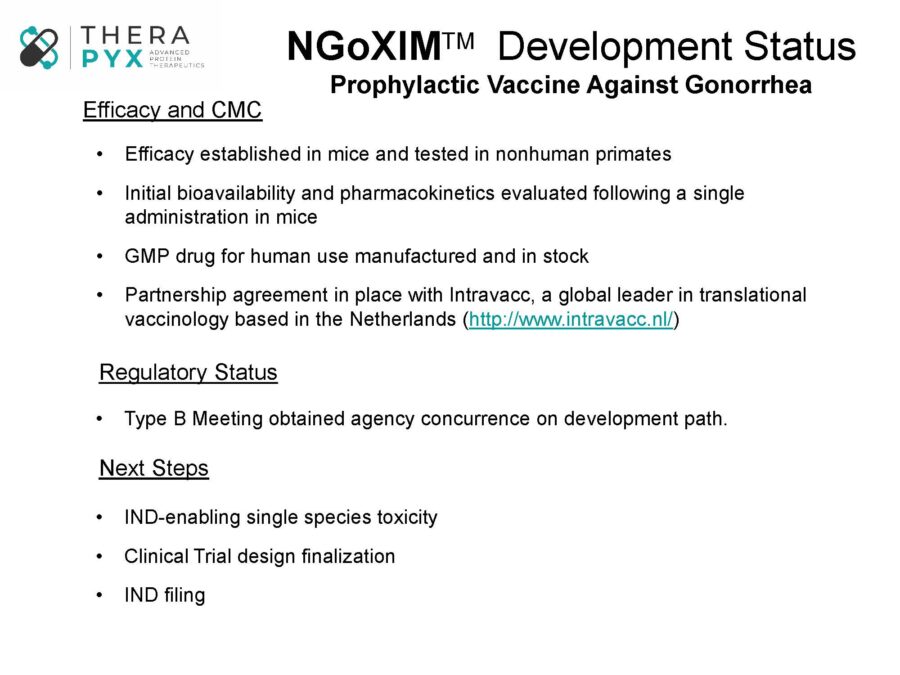 We are working closely with colleagues at IQVIA (Formerly Quintiles and IMS Health, Inc) and expect to file an IND soon that will enable a clinical trial aimed at providing critical proof of principle in select patients. Therapyx has also teamed up with Intravacc, the Institute for Translational Vaccinology, an experienced R&D organization that optimizes vaccines, vaccine processes and vaccine technologies. Together we are working to develop the world’s first prophylactic vaccine against gonorrhea, NGoXIM. It contains GneX12, along with specialized bacterial fragments that are immunogenic but not toxic. This product is intended for use in both men and women and is currently being optimized in non-human primates under a separate $2,800,000 Phase IIb SBIR award.