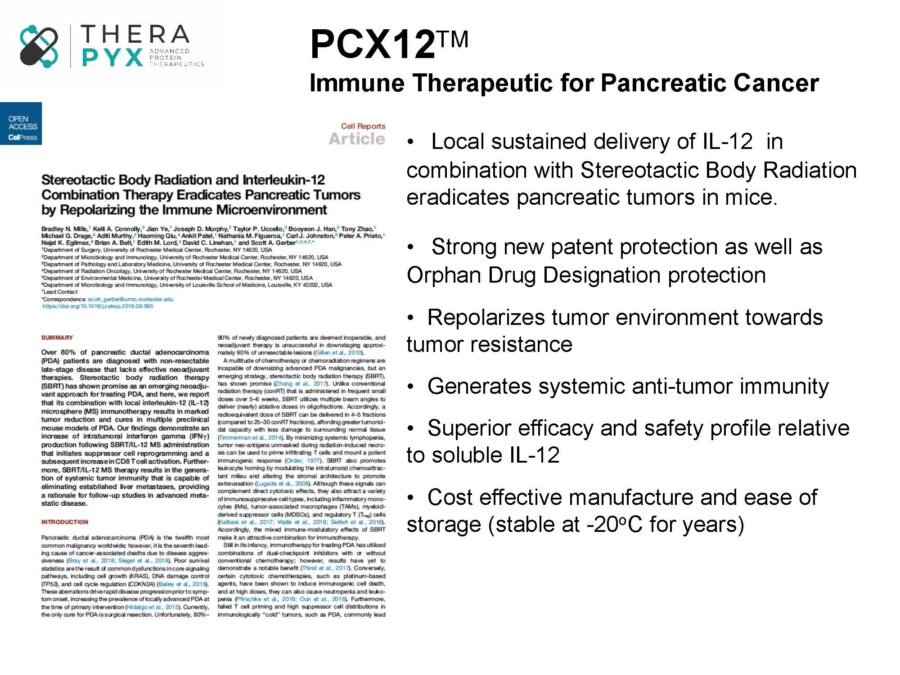 PCX12 is an encapsulated IL-12 formulation aimed at the treatment of pancreatic cancer, one of the deadliest forms of cancers, with a five-year survival rate of only 8.5%. It is generally resistant to chemotherapy and radiation, leaving surgical resection as one of the few successful treatments. However, this treatment is only effective for patients in the early stages of the disease, leaving patients in later stages without treatment options. Therapyx has developed PCX12 as an in-situ tumor vaccination approach where IL-12 is delivered directly into the microenvironment of an established tumor in a sustained manner. The tumor itself provides an abundant supply of fresh antigen. This strategy results in not only the rapid activation of pre-existing antitumor T-effector cells but also the development of a highly effective local as well as systemic anti-tumor immune response, which induces the complete eradication of tumors in mice, and the development of long-lived systemic anti-tumor immunity. Therapyx has teamed up with world-class oncologists at the University of Rochester to meet the challenges of pancreatic cancer. Bringing new hope to tens of thousands of patients, PCX12 will soon be tested in combination with a novel radiation therapy called Stereotactic Body Radiation Therapy (SBRT).