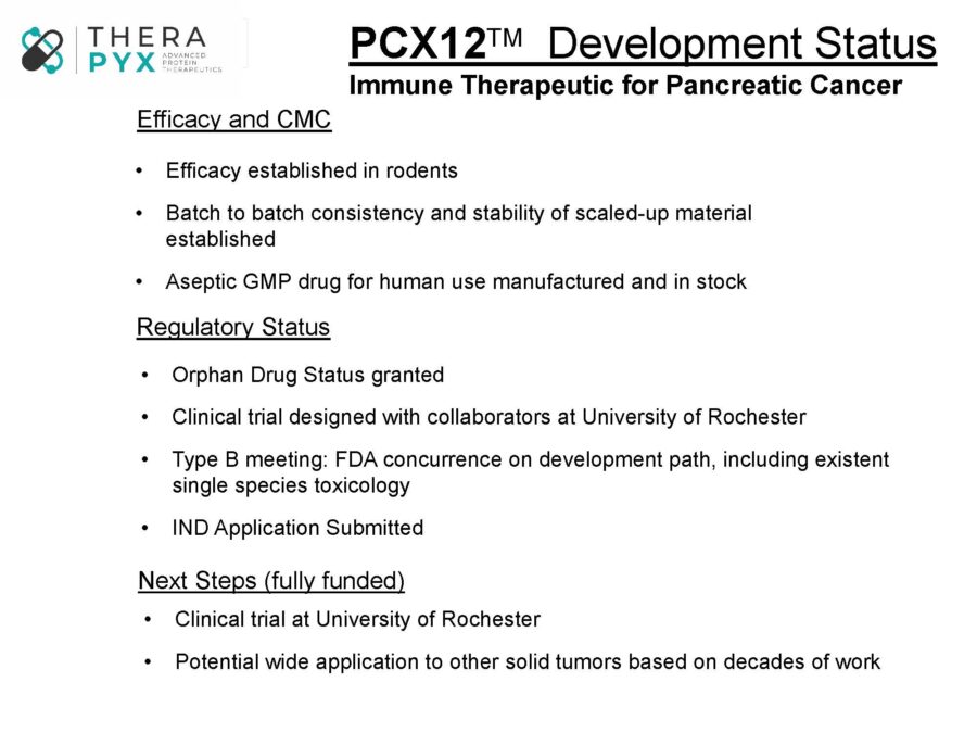 The FDA has recently awarded orphan designation to PCX12 as a treatment for pancreatic cancer, and in a pre-IND meeting, generally concurred with our development plan. Working closely with colleagues at the University of Rochester, we have filed an IND application, which will soon enable a clinical trial aimed at providing critical proof of principle in patients.